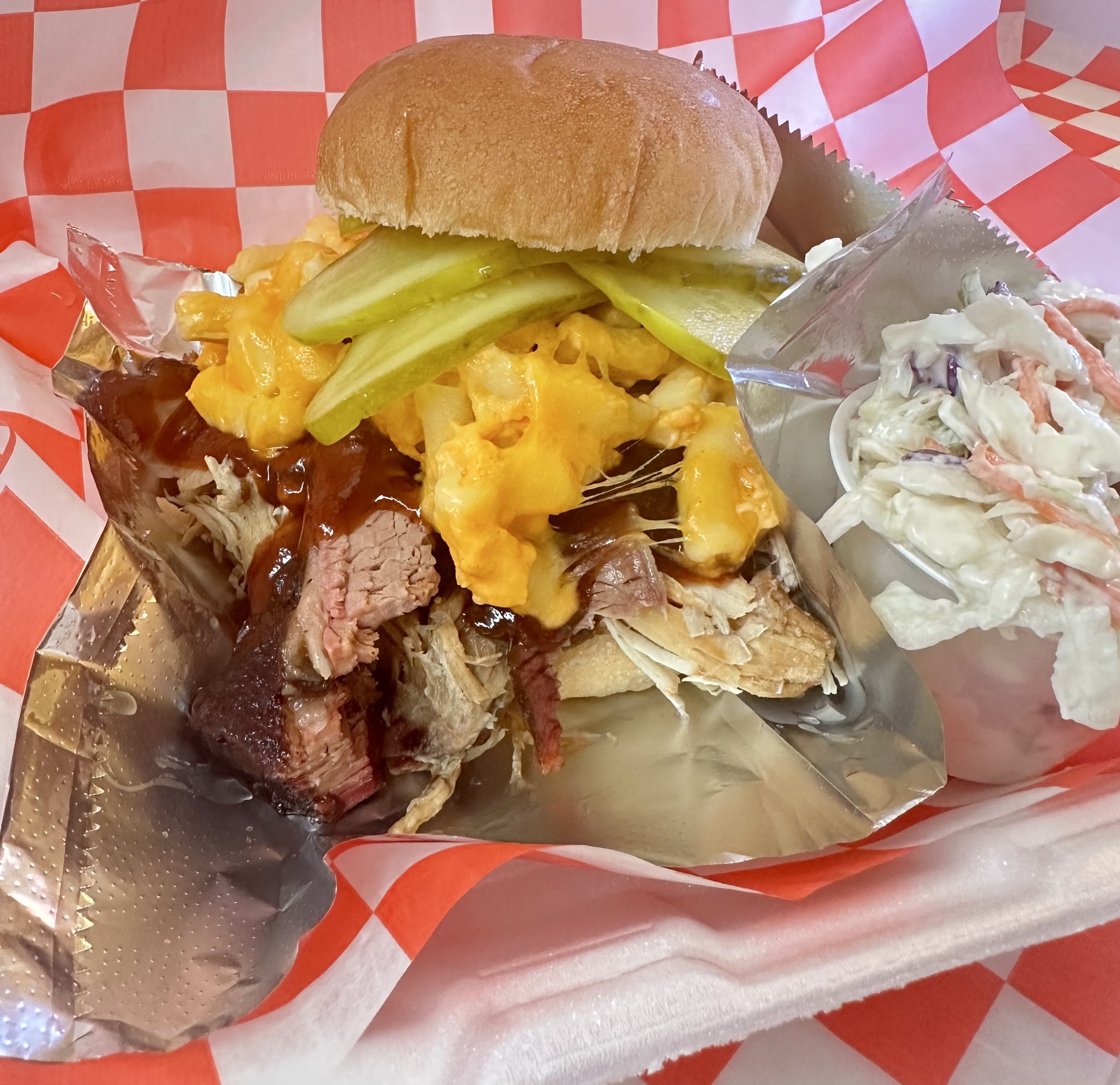 Pulled pork, pulled chicken, beef brisket, all piled high on a bun. Topped with mac & cheese, dill pickle slices and served with slaw on the side.