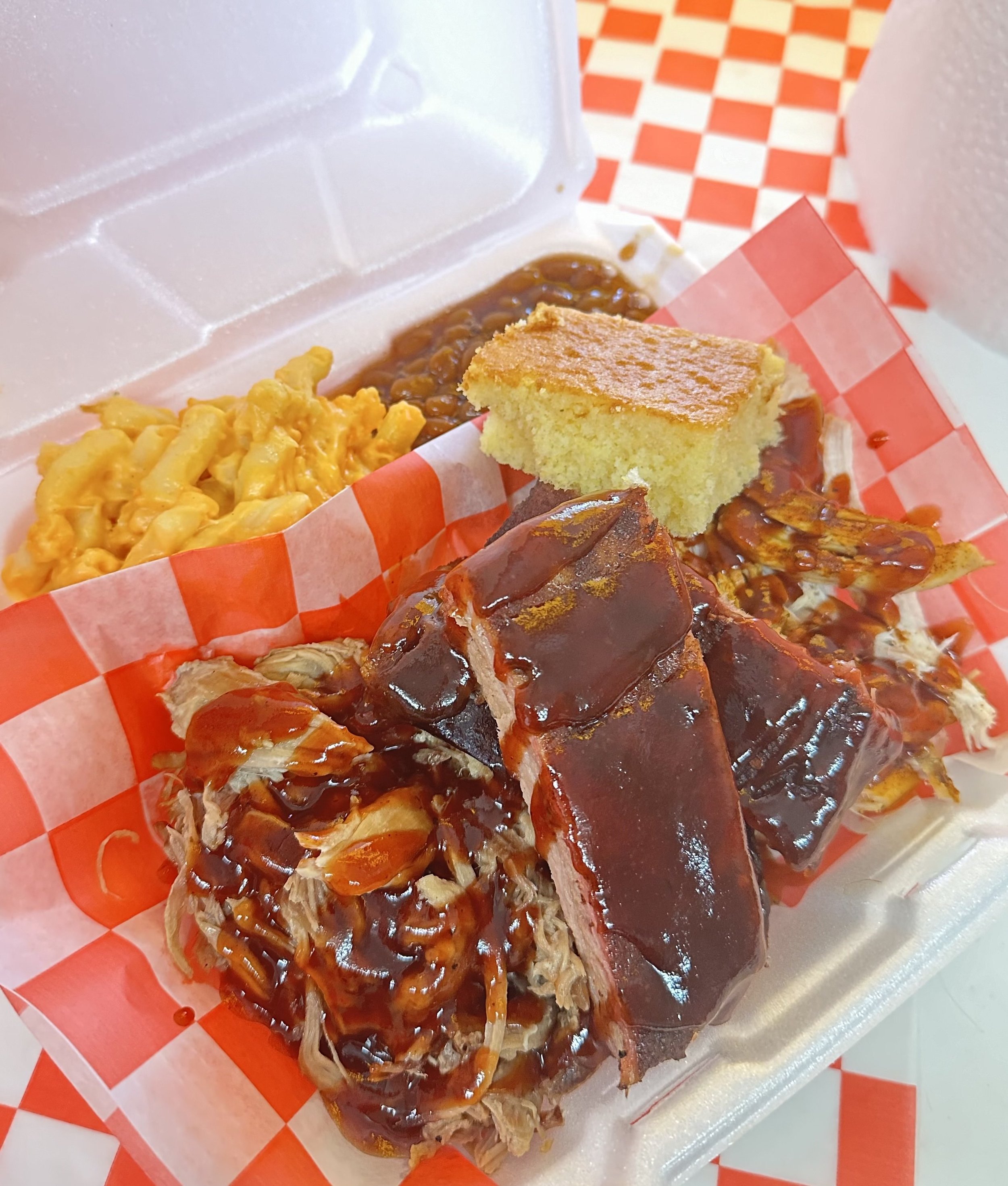 A feast fit for a family! Starting with a 1/2 slab of ribs, a pound of hickory smoked pulled pork, a 1/2 pound of pulled chicken, a pound of mac & cheese, a pound of baked beans, a 1/2 pound of cole slaw and potato salad and 3 to 4 cornbread!