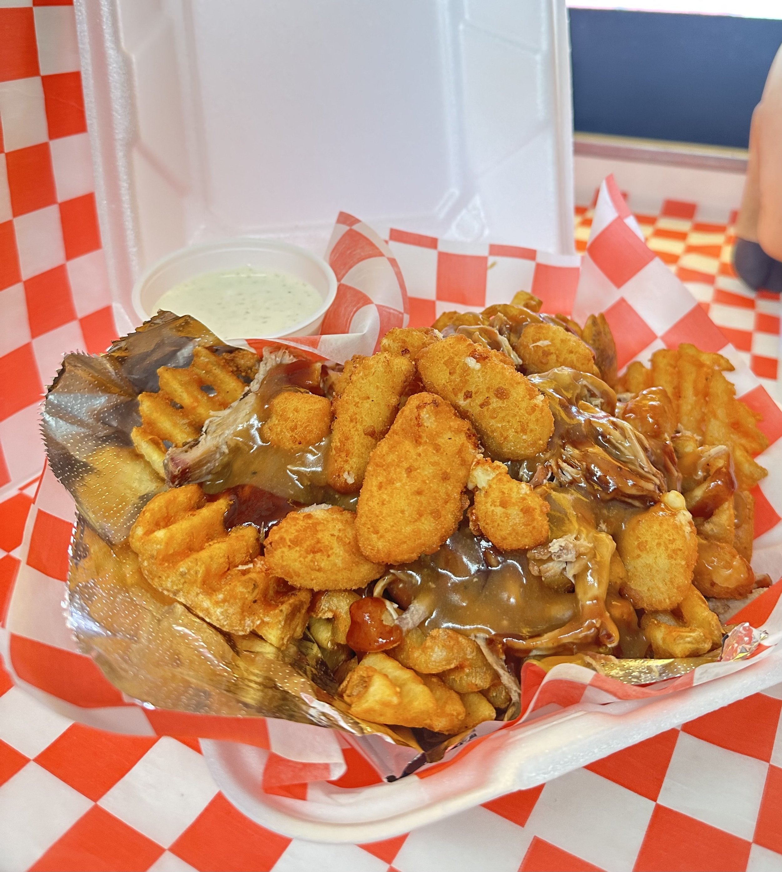 Our seasoned waffle fries covered with pulled pork, sweet BBQ sauce, gravy and topped with deep fried cheese curds, served with a side of homemade ranch.